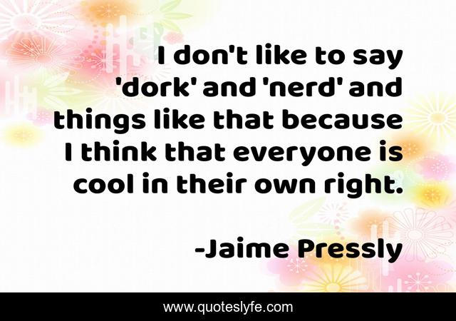 This page presents the quote "I don't like to say 'dork' and 'nerd' and things like that because I think that everyone is cool in their own right.". Author of this quote is Jaime Pressly. This quote is about right, think,.
