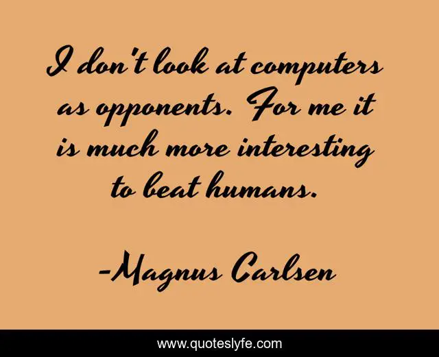 This page presents the quote "I don't look at computers as opponents. For me it is much more interesting to beat humans.". Author of this quote is Magnus Carlsen. This quote is about me, interesting, look,.
