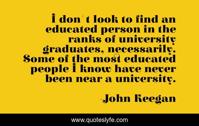 This page presents the quote "I don't look to find an educated person in the ranks of university graduates, necessarily. Some of the most educated people I know have never been near a university.". Author of this quote is John Keegan. This quote is about look, people,.