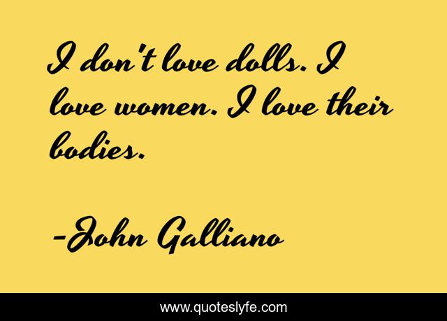 This page presents the quote "I don't love dolls. I love women. I love their bodies.". Author of this quote is John Galliano. This quote is about i love, love, affection, dolls,.