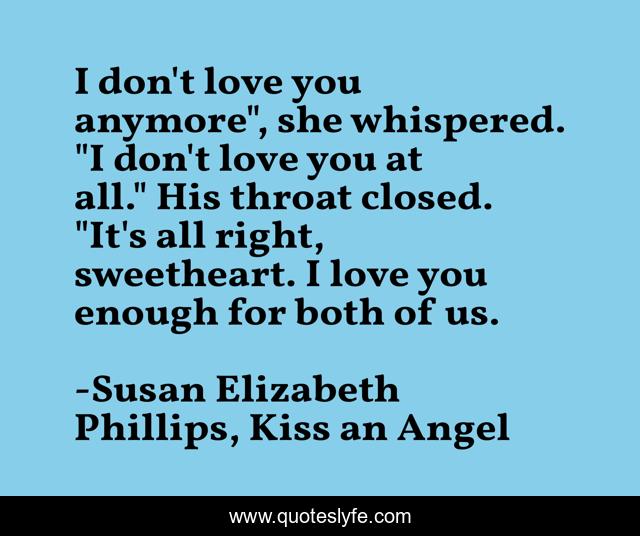 This page presents the quote "I don't love you anymore", she whispered. "I don't love you at all." His throat closed. "It's all right, sweetheart. I love you enough for both of us.". Author of this quote is Susan Elizabeth Phillips, Kiss an Angel. This quote is about love, affection,.