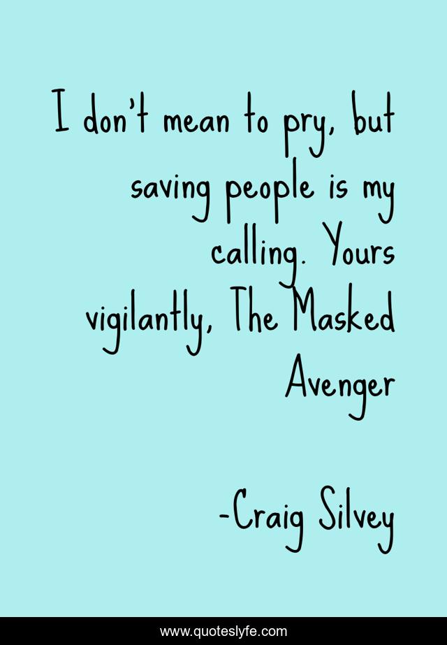 This page presents the quote "I don't mean to pry, but saving people is my calling. Yours vigilantly, The Masked Avenger". Author of this quote is Craig Silvey. This quote is about action, craig-silvey, saving, the-masked-avenger, helping-others,.