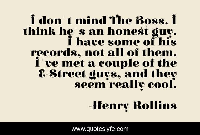 This page presents the quote "I don't mind The Boss. I think he's an honest guy. I have some of his records, not all of them. I've met a couple of the E-Street guys, and they seem really cool.". Author of this quote is Henry Rollins. This quote is about mind, think, boss,.