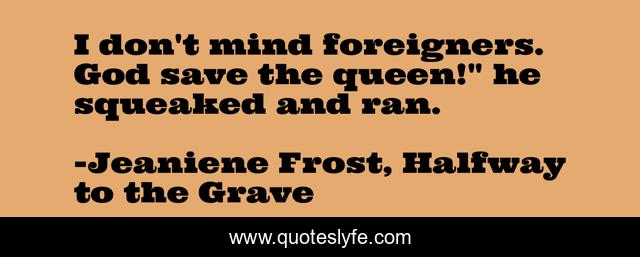 This page presents the quote "I don't mind foreigners. God save the queen!" he squeaked and ran.". Author of this quote is Jeaniene Frost, Halfway to the Grave. This quote is about frost, humor, jeaniene, timmie,.