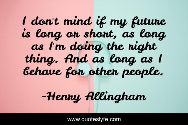 This page presents the quote "I don't mind if my future is long or short, as long as I'm doing the right thing. And as long as I behave for other people.". Author of this quote is Henry Allingham. This quote is about short, mind, people,.