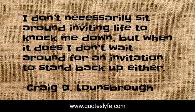 This page presents the quote "I don’t necessarily sit around inviting life to knock me down, but when it does I don’t wait around for an invitation to stand back up either.". Author of this quote is Craig D. Lounsbrough. This quote is about setbacks, living, life, reverse, invite, knocked-down, tenacious, persistent, defeated,.