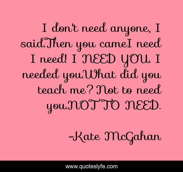 This page presents the quote "I don't need anyone, I said.Then you cameI need I need! I NEED YOU. I needed you.What did you teach me?Not to need you.NOT TO NEED.". Author of this quote is Kate McGahan. This quote is about need, dependency, love, affection, learn,.