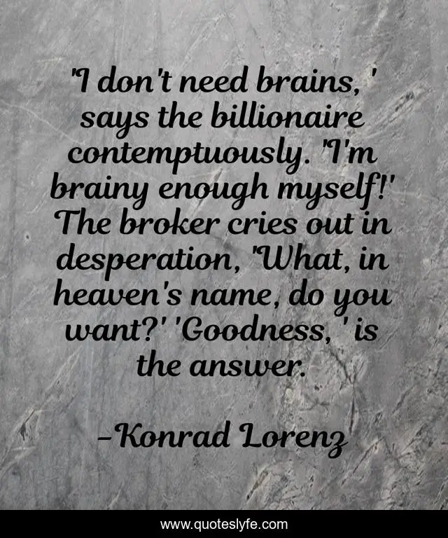 This page presents the quote "'I don't need brains, ' says the billionaire contemptuously. 'I'm brainy enough myself!' The broker cries out in desperation, 'What, in heaven's name, do you want?' 'Goodness, ' is the answer.". Author of this quote is Konrad Lorenz. This quote is about myself, name,.