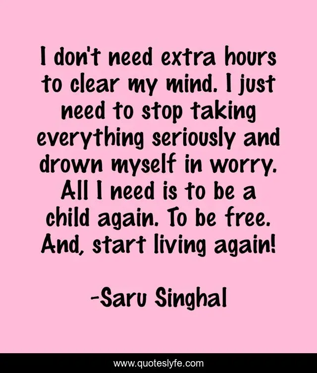 This page presents the quote "I don't need extra hours to clear my mind. I just need to stop taking everything seriously and drown myself in worry. All I need is to be a child again. To be free. And, start living again!". Author of this quote is Saru Singhal. This quote is about worry, life-and-sayings,.