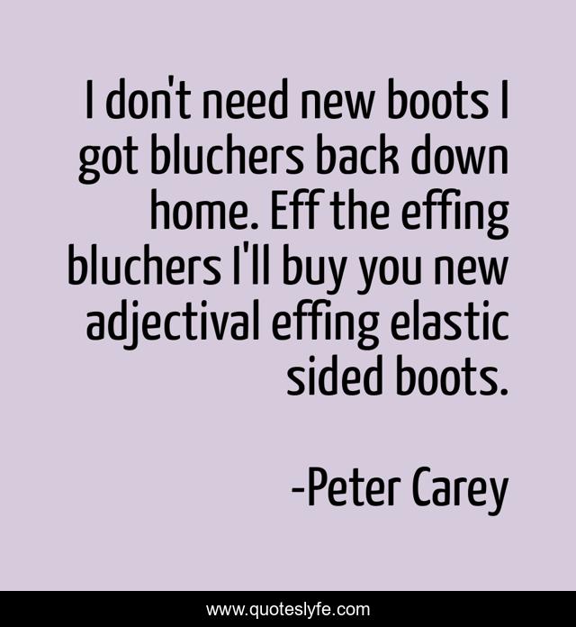 This page presents the quote "I don't need new boots I got bluchers back down home. Eff the effing bluchers I'll buy you new adjectival effing elastic sided boots.". Author of this quote is Peter Carey. This quote is about humorous, profanity,.