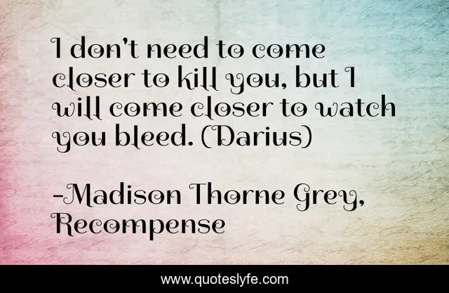 This page presents the quote "I don't need to come closer to kill you, but I will come closer to watch you bleed. (Darius)". Author of this quote is Madison Thorne Grey, Recompense. This quote is about alpha-male, paranormal-romance-book, fantasy-romance-book, paranormal-romance, alpha-males,.