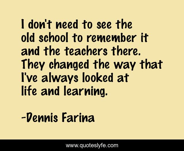 This page presents the quote "I don't need to see the old school to remember it and the teachers there. They changed the way that I've always looked at life and learning.". Author of this quote is Dennis Farina. This quote is about life, school, remember,.