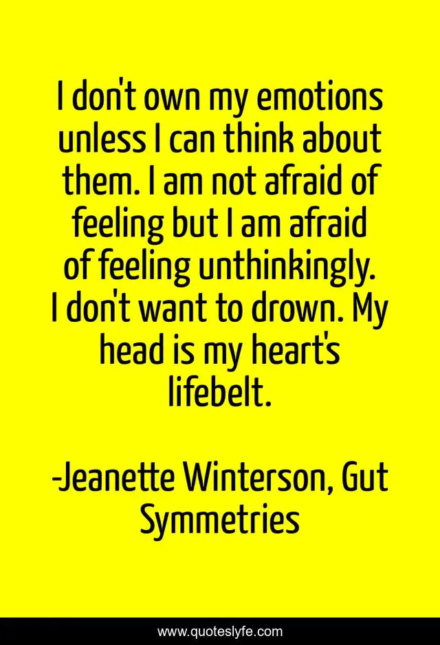 This page presents the quote "I don't own my emotions unless I can think about them. I am not afraid of feeling but I am afraid of feeling unthinkingly. I don't want to drown. My head is my heart's lifebelt.". Author of this quote is Jeanette Winterson, Gut Symmetries. This quote is about head-and-heart, emotions, feelings,.