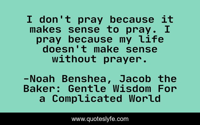 This page presents the quote "I don't pray because it makes sense to pray. I pray because my life doesn't make sense without prayer.". Author of this quote is Noah Benshea, Jacob the Baker: Gentle Wisdom For a Complicated World. .