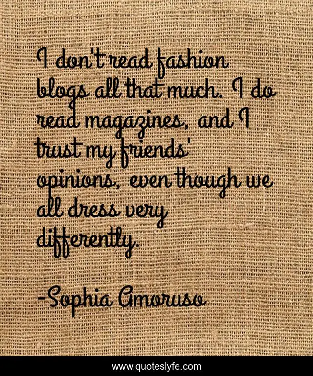 This page presents the quote "I don't read fashion blogs all that much. I do read magazines, and I trust my friends' opinions, even though we all dress very differently.". Author of this quote is Sophia Amoruso. This quote is about friends, fashion, dress,.