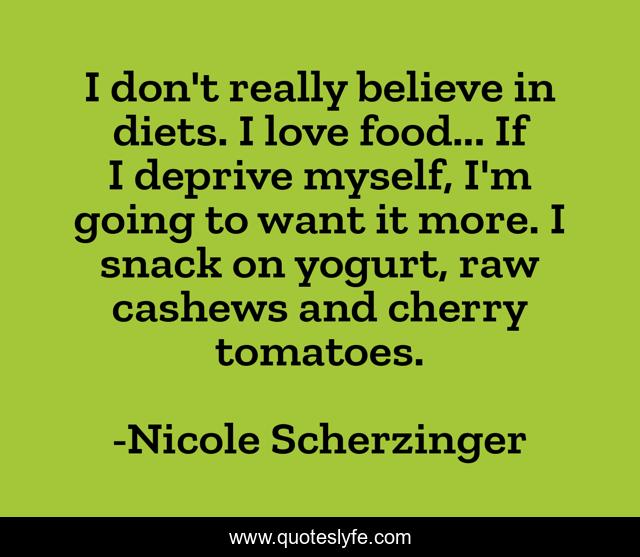 This page presents the quote "I don't really believe in diets. I love food... If I deprive myself, I'm going to want it more. I snack on yogurt, raw cashews and cherry tomatoes.". Author of this quote is Nicole Scherzinger. This quote is about myself, believe, love, affection,.
