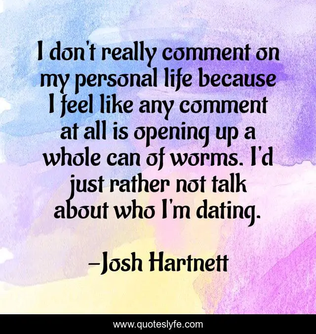 This page presents the quote "I don't really comment on my personal life because I feel like any comment at all is opening up a whole can of worms. I'd just rather not talk about who I'm dating.". Author of this quote is Josh Hartnett. This quote is about personal, life, opening,.