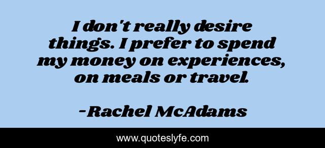 This page presents the quote "I don't really desire things. I prefer to spend my money on experiences, on meals or travel.". Author of this quote is Rachel McAdams. This quote is about desire, money, experiences,.