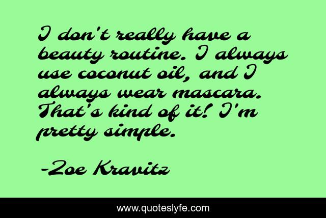 This page presents the quote "I don't really have a beauty routine. I always use coconut oil, and I always wear mascara. That's kind of it! I'm pretty simple.". Author of this quote is Zoe Kravitz. This quote is about simple, kind, oil,.