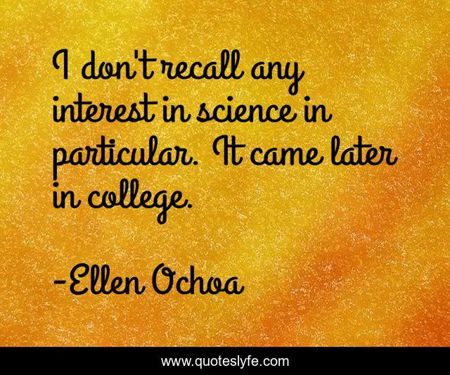 This page presents the quote "I don't recall any interest in science in particular. It came later in college.". Author of this quote is Ellen Ochoa. This quote is about later, college, interest,.