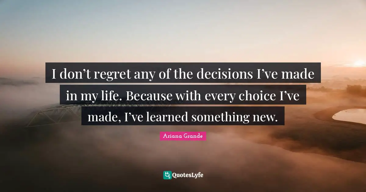 This page presents the quote "I don’t regret any of the decisions I’ve made in my life. Because with every choice I’ve made, I’ve learned something new.". Author of this quote is Ariana Grande. This quote is about regret, decision, life, choices, something new, made,.