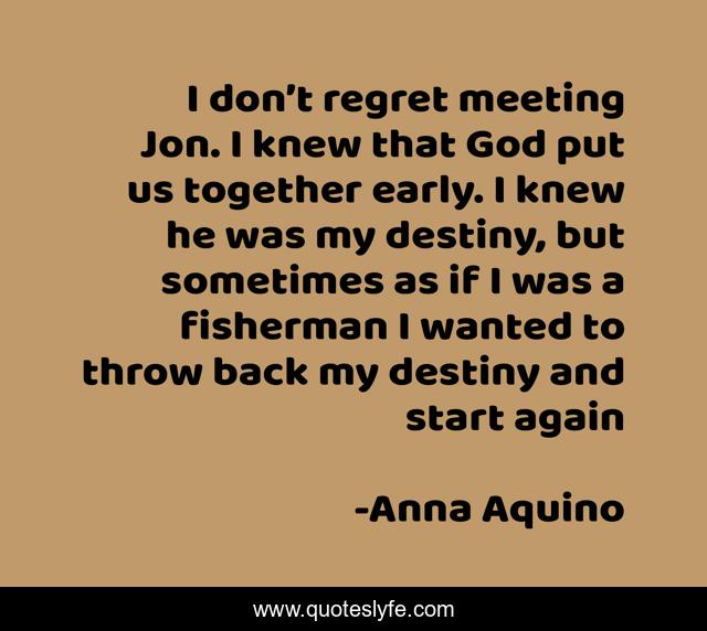 This page presents the quote "I don’t regret meeting Jon. I knew that God put us together early. I knew he was my destiny, but sometimes as if I was a fisherman I wanted to throw back my destiny and start again". Author of this quote is Anna Aquino. This quote is about relationships, faith, a-marriage-in-time, marriage, christian,.