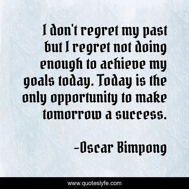 This page presents the quote "I don't regret my past but I regret not doing enough to achieve my goals today. Today is the only opportunity to make tomorrow a success.". Author of this quote is Oscar Bimpong. This quote is about past, future, regret, success, tomorrow-will-be-a-better-day,.