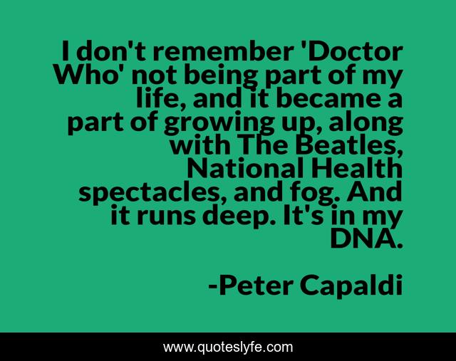 This page presents the quote "I don't remember 'Doctor Who' not being part of my life, and it became a part of growing up, along with The Beatles, National Health spectacles, and fog. And it runs deep. It's in my DNA.". Author of this quote is Peter Capaldi. This quote is about life, deep, doctor,.