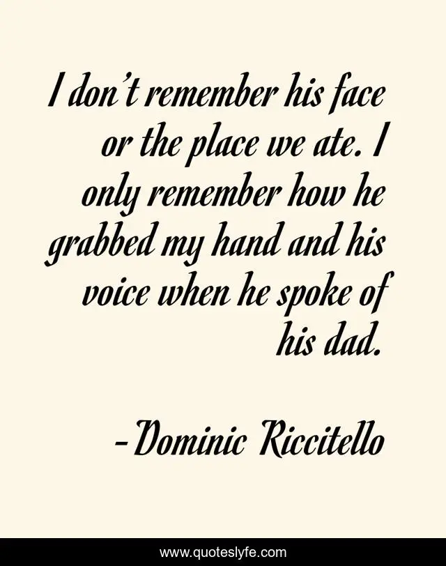 This page presents the quote "I don’t remember his face or the place we ate. I only remember how he grabbed my hand and his voice when he spoke of his dad.". Author of this quote is Dominic Riccitello. This quote is about dad, remembering, dating, love, face, quote, thoughts, father, reality,.