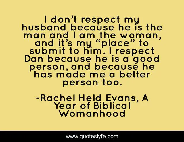 "Rachel Held Evans, A Year of Biblical Womanhood Quotes." Quoteslyfe.com, 2025. Mon. 08 Dec. 2025. <https://www.quoteslyfe.com/quote/I-don-t-respect-my-husband-because-76766>.