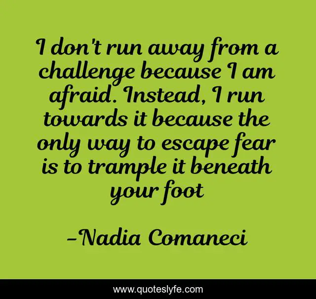 This page presents the quote "I don't run away from a challenge because I am afraid. Instead, I run towards it because the only way to escape fear is to trample it beneath your foot". Author of this quote is Nadia Comaneci. This quote is about gymnast, challenge, fear,.