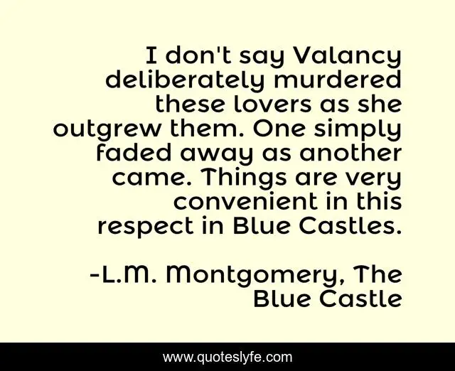 This page presents the quote "I don't say Valancy deliberately murdered these lovers as she outgrew them. One simply faded away as another came. Things are very convenient in this respect in Blue Castles.". Author of this quote is L.M. Montgomery, The Blue Castle. This quote is about imagination, love-deferred, dreams, hope, singleness,.