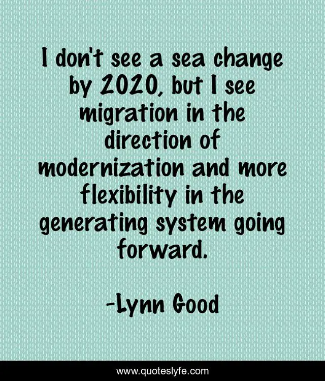 This page presents the quote "I don't see a sea change by 2020, but I see migration in the direction of modernization and more flexibility in the generating system going forward.". Author of this quote is Lynn Good. This quote is about direction, see, sea,.