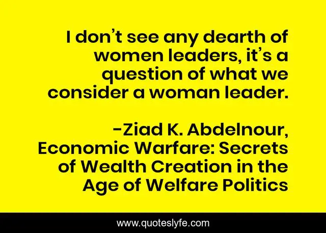 This page presents the quote "I don’t see any dearth of women leaders, it’s a question of what we consider a woman leader.". Author of this quote is Ziad K. Abdelnour, Economic Warfare: Secrets of Wealth Creation in the Age of Welfare Politics. This quote is about woman, leaders, women,.