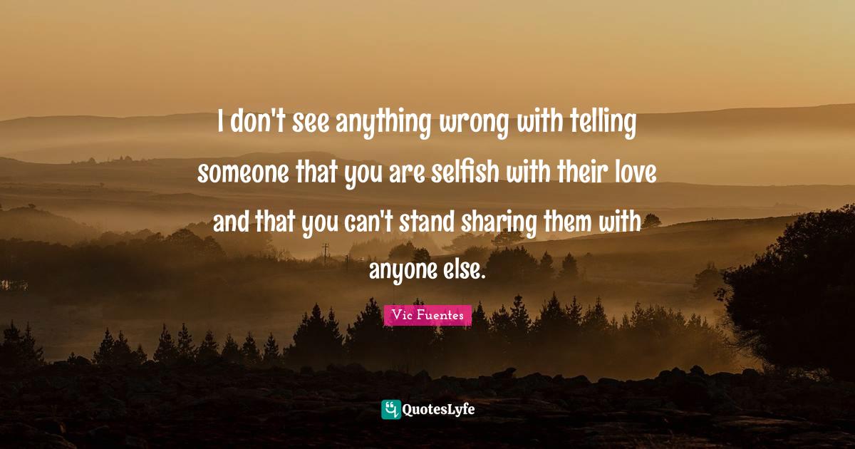 This page presents the quote "I don't see anything wrong with telling someone that you are selfish with their love and that you can't stand sharing them with anyone else.". Author of this quote is Vic Fuentes. This quote is about love, selfish,.