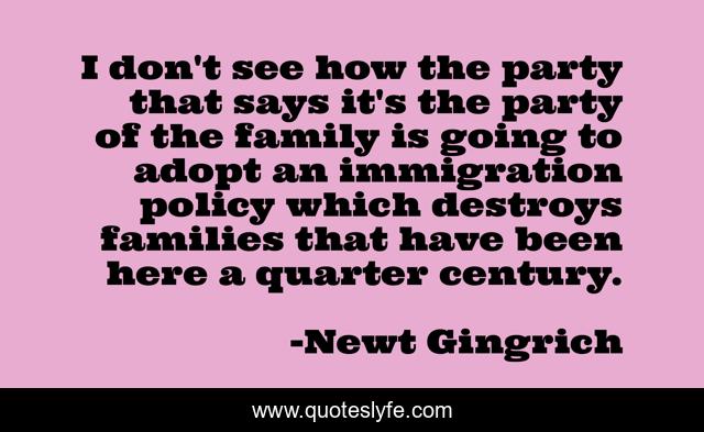 This page presents the quote "I don't see how the party that says it's the party of the family is going to adopt an immigration policy which destroys families that have been here a quarter century.". Author of this quote is Newt Gingrich. This quote is about party, see, immigration,.