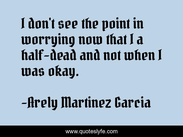 This page presents the quote "I don't see the point in worrying now that I a half-dead and not when I was okay.". Author of this quote is Arely Martinez Garcia. This quote is about worrying, dead,.
