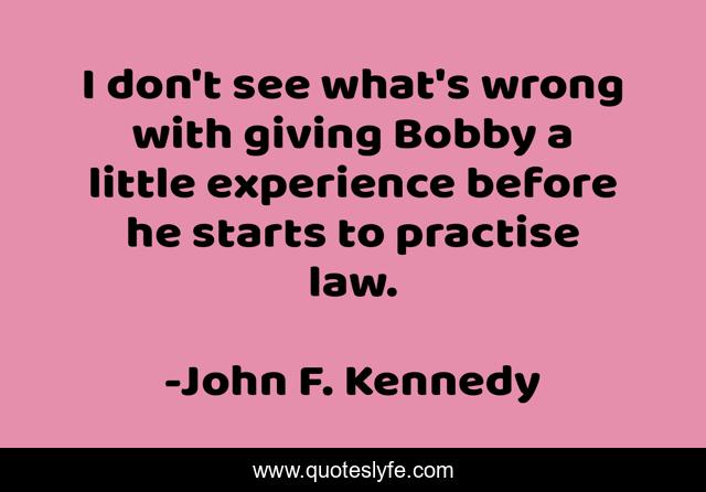 This page presents the quote "I don't see what's wrong with giving Bobby a little experience before he starts to practise law.". Author of this quote is John F. Kennedy. This quote is about quips, comments,.