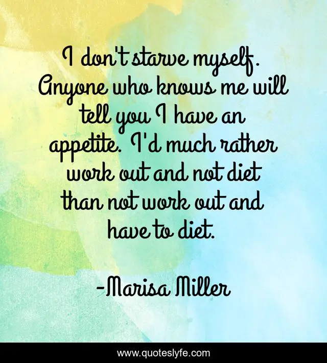 This page presents the quote "I don't starve myself. Anyone who knows me will tell you I have an appetite. I'd much rather work out and not diet than not work out and have to diet.". Author of this quote is Marisa Miller. This quote is about me, myself, work,.