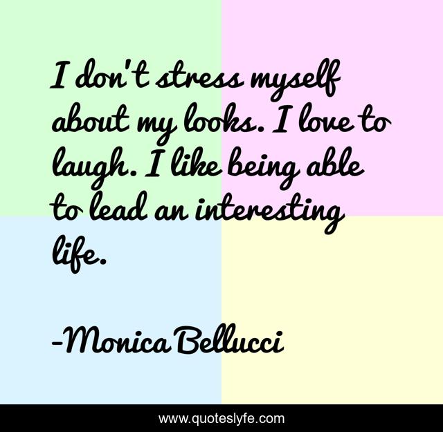 This page presents the quote "I don't stress myself about my looks. I love to laugh. I like being able to lead an interesting life.". Author of this quote is Monica Bellucci. This quote is about stress, myself, life,.