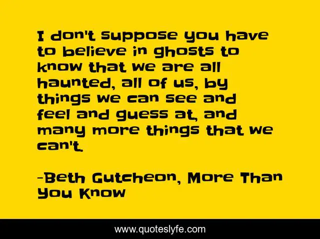 This page presents the quote "I don't suppose you have to believe in ghosts to know that we are all haunted, all of us, by things we can see and feel and guess at, and many more things that we can't.". Author of this quote is Beth Gutcheon, More Than You Know. This quote is about feel, ghosts, believe, life,.