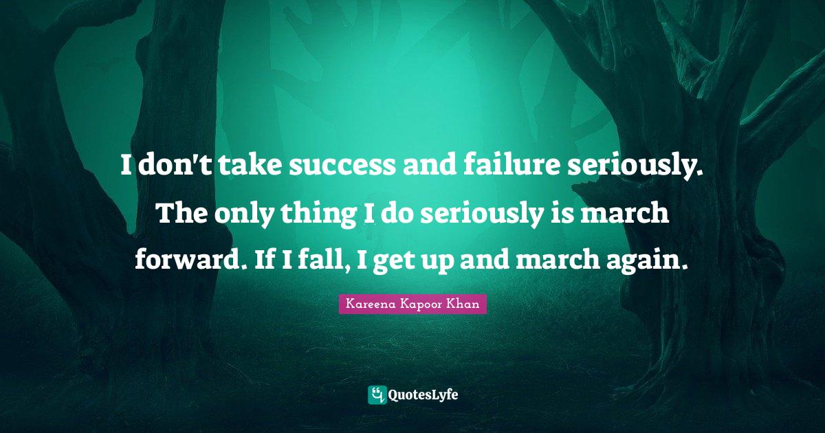This page presents the quote "I don't take success and failure seriously. The only thing I do seriously is march forward. If I fall, I get up and march again.". Author of this quote is Kareena Kapoor Khan. This quote is about forward, success, fall,.