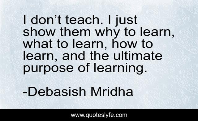 This page presents the quote "I don’t teach. I just show them why to learn, what to learn, how to learn, and the ultimate purpose of learning.". Author of this quote is Debasish Mridha. This quote is about miraboli, inspirational, oscar-wilde, philosophy, debasish-mridha, tagore, quotes, buddha, debasish-mridha-md,.