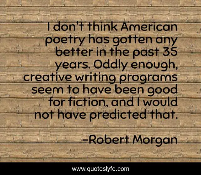 This page presents the quote "I don't think American poetry has gotten any better in the past 35 years. Oddly enough, creative writing programs seem to have been good for fiction, and I would not have predicted that.". Author of this quote is Robert Morgan. This quote is about past, good, writing,.