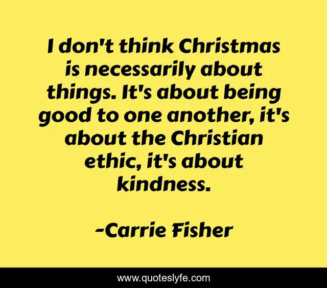 This page presents the quote "I don't think Christmas is necessarily about things. It's about being good to one another, it's about the Christian ethic, it's about kindness.". Author of this quote is Carrie Fisher. This quote is about kindness, good, christian,.
