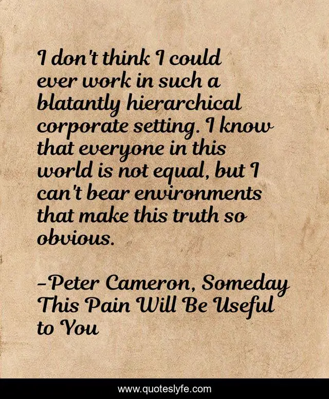 This page presents the quote "I don't think I could ever work in such a blatantly hierarchical corporate setting. I know that everyone in this world is not equal, but I can't bear environments that make this truth so obvious.". Author of this quote is Peter Cameron, Someday This Pain Will Be Useful to You. This quote is about life, equality, truth,.