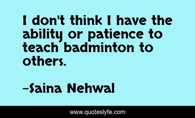 This page presents the quote "I don't think I have the ability or patience to teach badminton to others.". Author of this quote is Saina Nehwal. This quote is about teach, think, ability,.