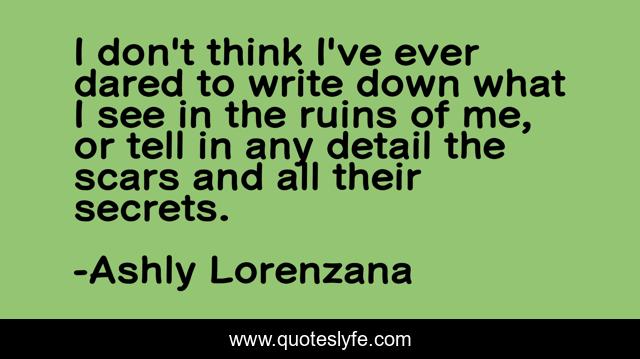 This page presents the quote "I don't think I've ever dared to write down what I see in the ruins of me, or tell in any detail the scars and all their secrets.". Author of this quote is Ashly Lorenzana. This quote is about secrets, scars, poetry, emotions, writing, despair,.