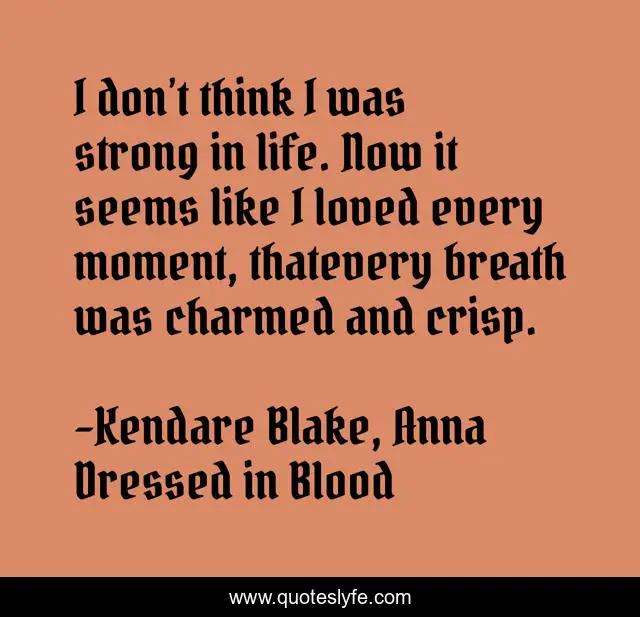 This page presents the quote "I don’t think I was strong in life. Now it seems like I loved every moment, thatevery breath was charmed and crisp.". Author of this quote is Kendare Blake, Anna Dressed in Blood. This quote is about fiction-novel, book, anna-dressed-in-blood,.