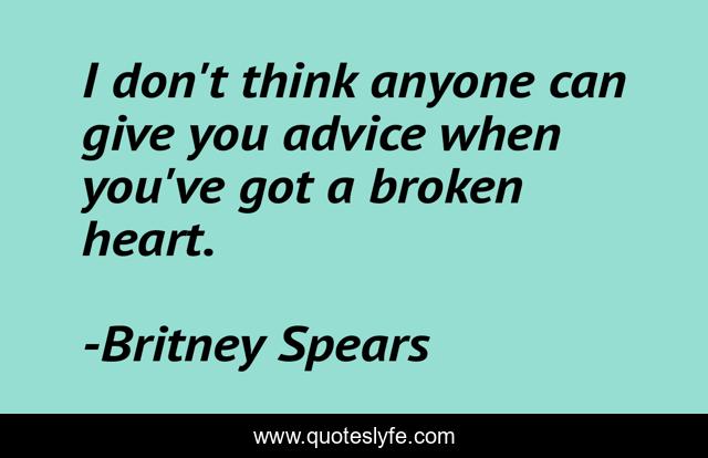 This page presents the quote "I don't think anyone can give you advice when you've got a broken heart.". Author of this quote is Britney Spears. This quote is about advice, heartbreak,.
